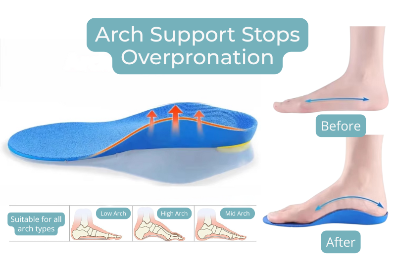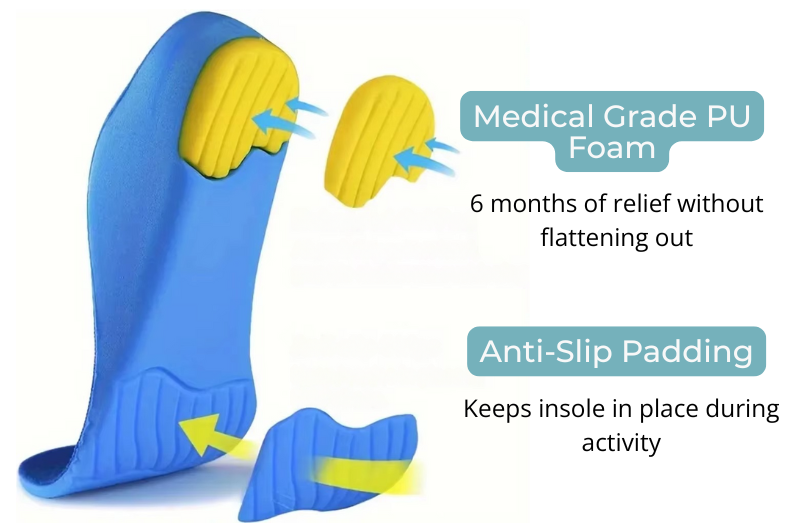 Our arch support straightens out their foot mechanics to stop the inward rolling, which means way less pulling and strain on the heel.